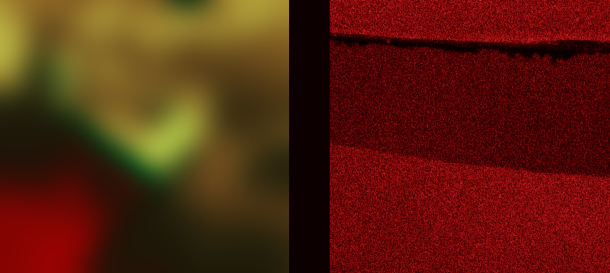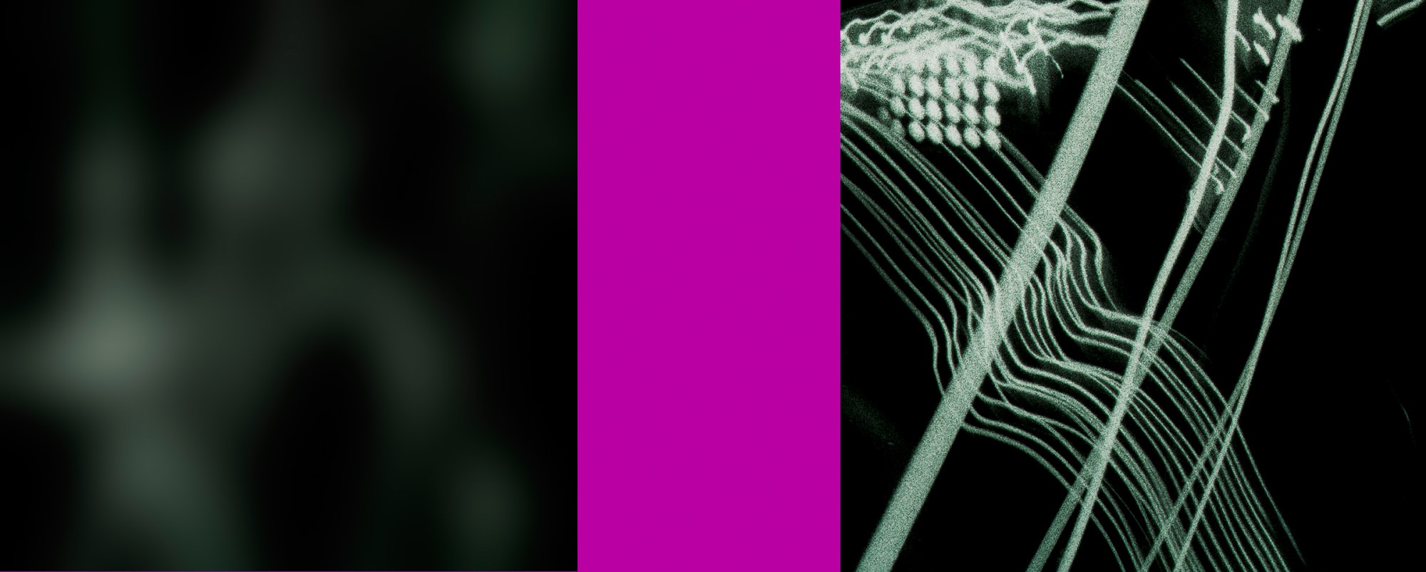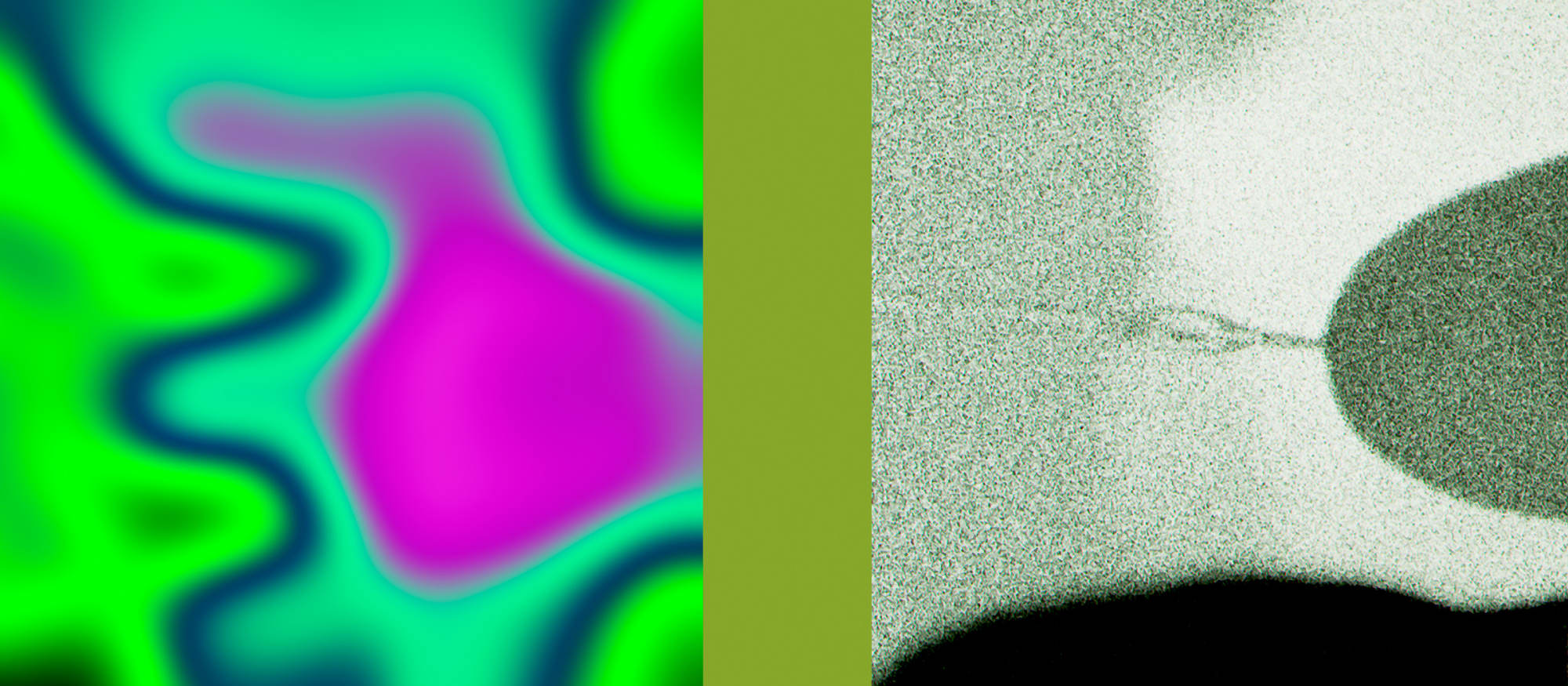 I conceal the connecting element between the incompatible abstract halves of the images in my following series behind minimalist monochrome colour fields. I call it “Mona Lisa Smiles”.