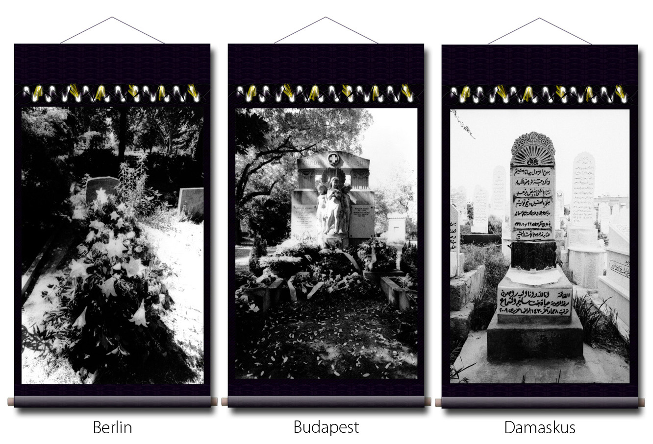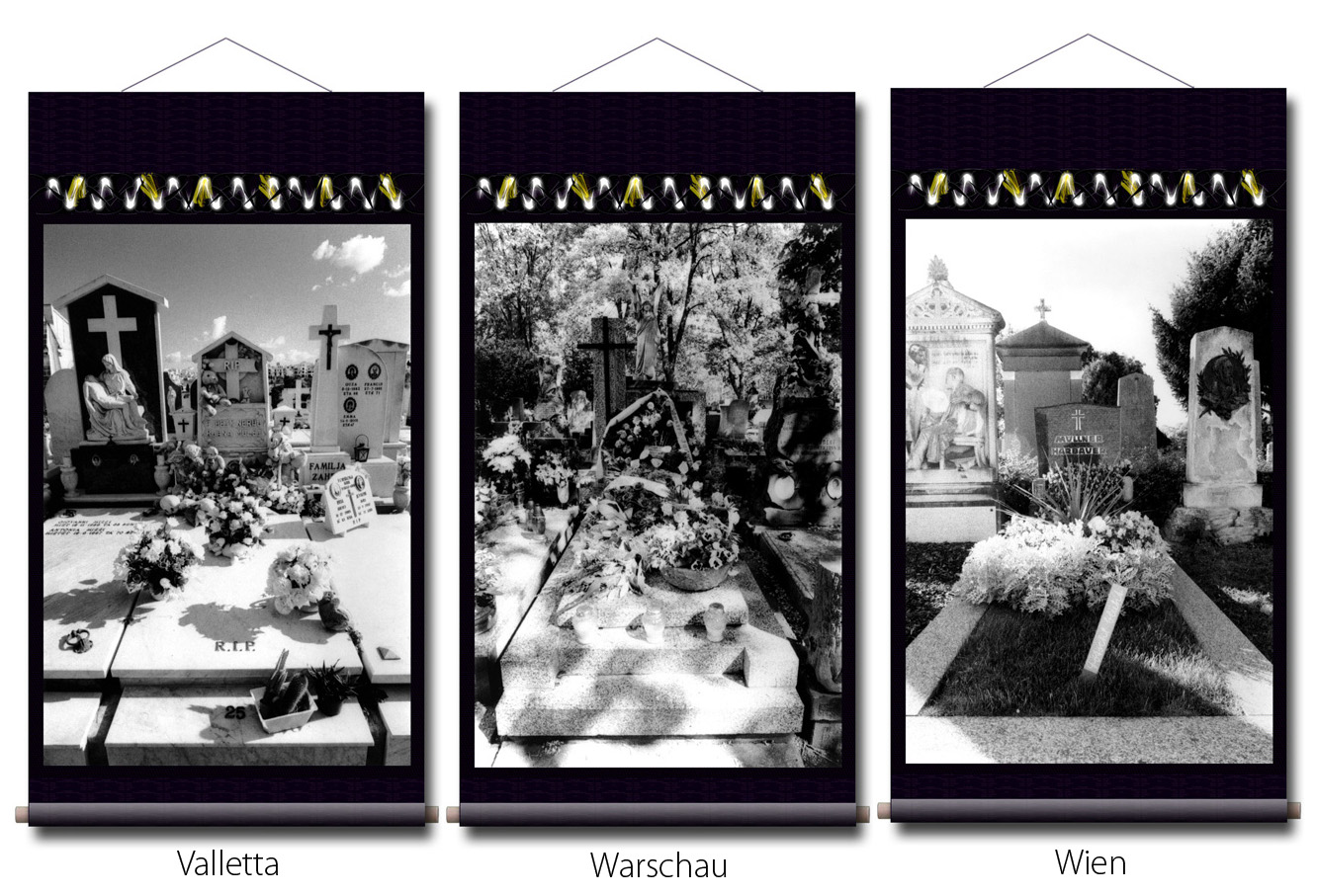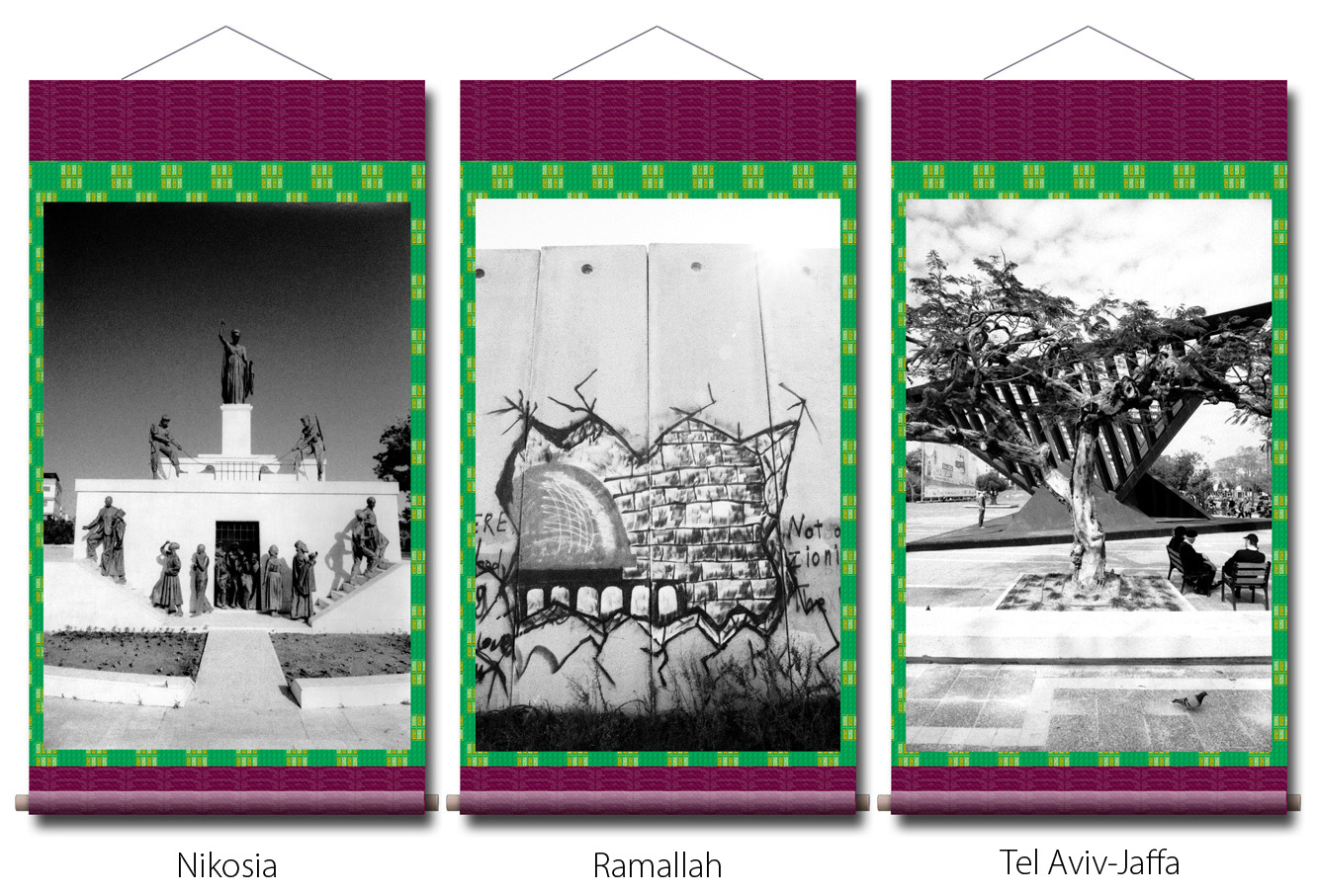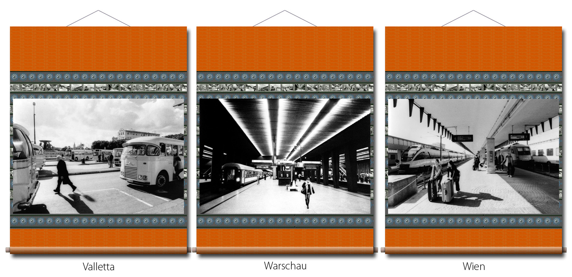 Photographien: in den Ausstellungen sind als großformatige Rollbilder zu sehen. Das flexible Material erinnert an die Stoffkunst der nomadischen und orientalischen Völker. Die Rollbilder sind daher ein idealer transmediterraner Brückenschlag zwischen den Menschen in Europa, Asien und des Nahen Osten.