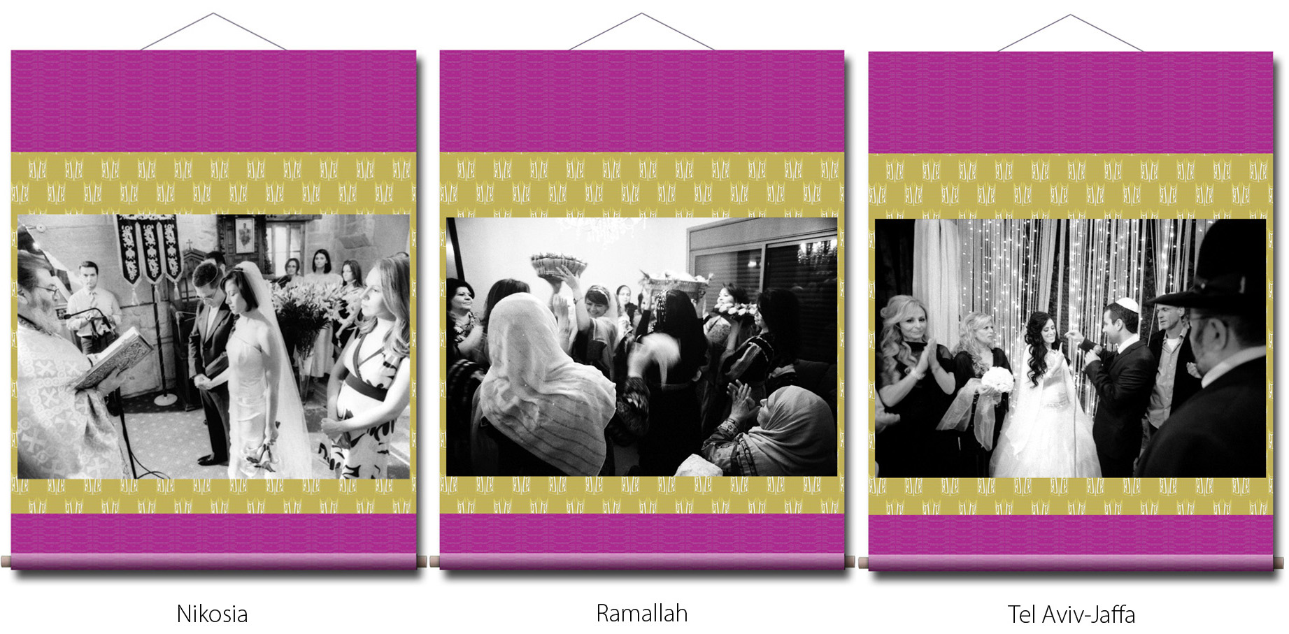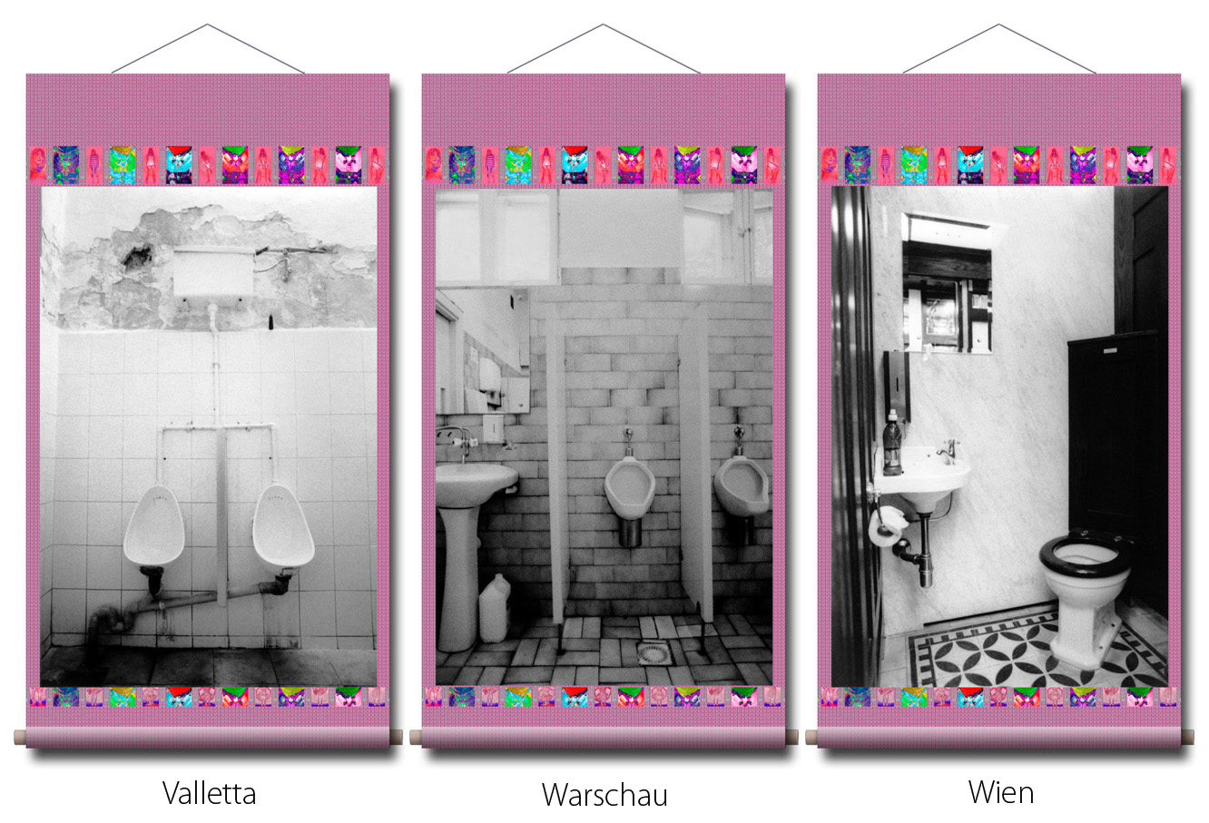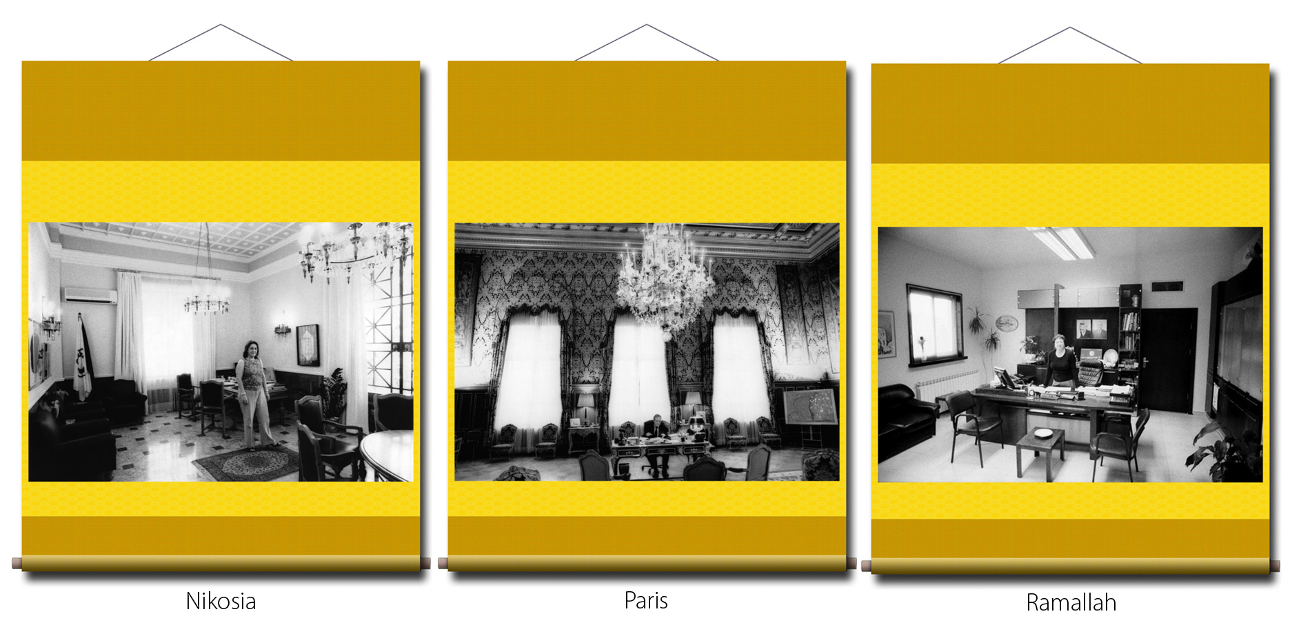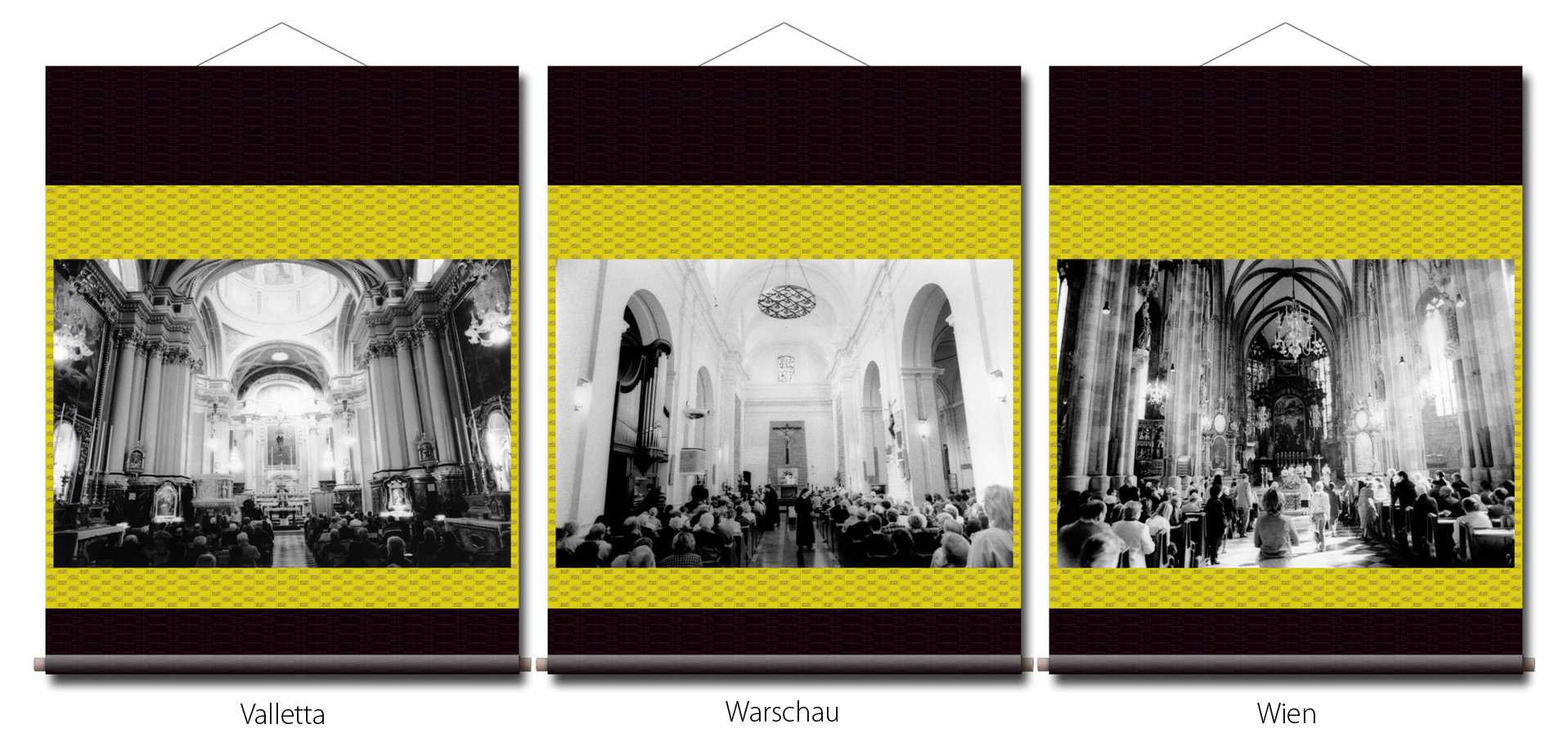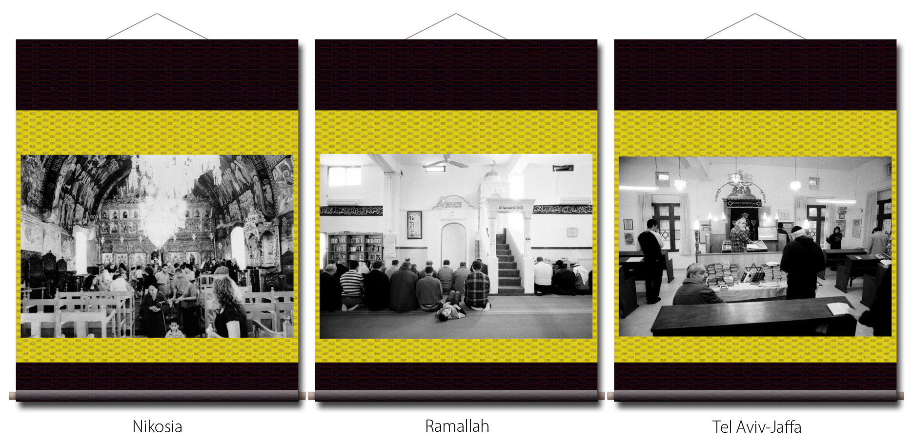 Photographien: in den Ausstellungen sind als großformatige Rollbilder zu sehen. Das flexible Material erinnert an die Stoffkunst der nomadischen und orientalischen Völker. Die Rollbilder sind daher ein idealer transmediterraner Brückenschlag zwischen den Menschen in Europa, Asien und des Nahen Osten.