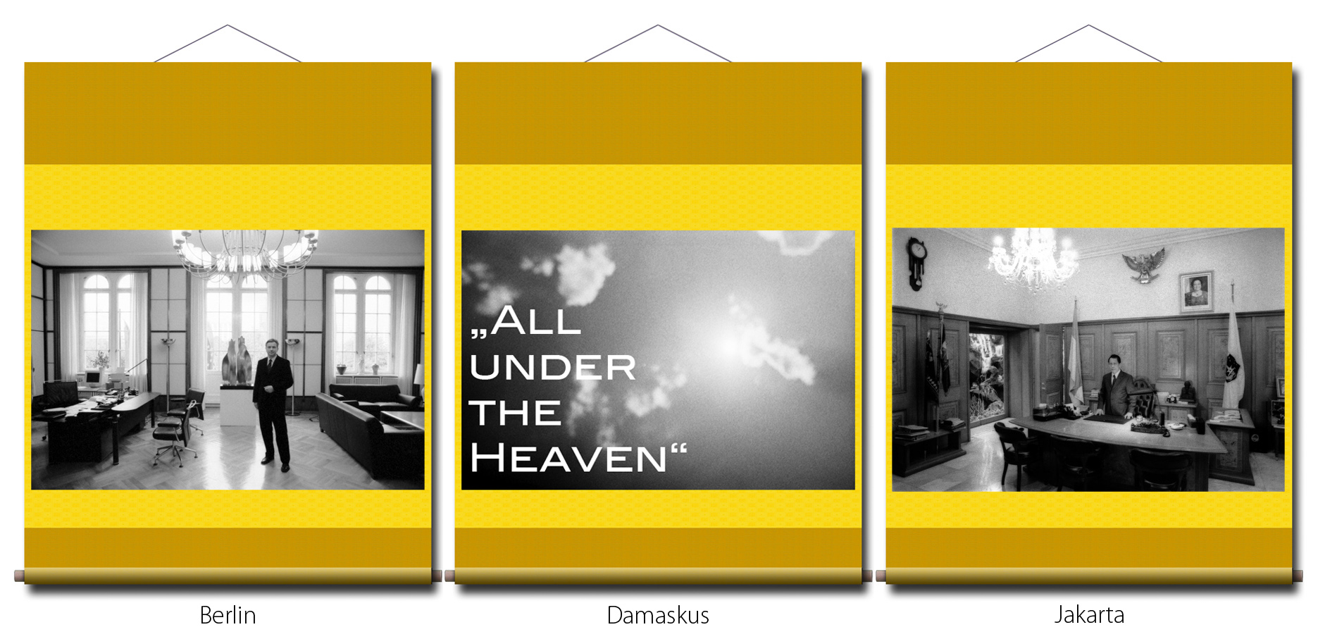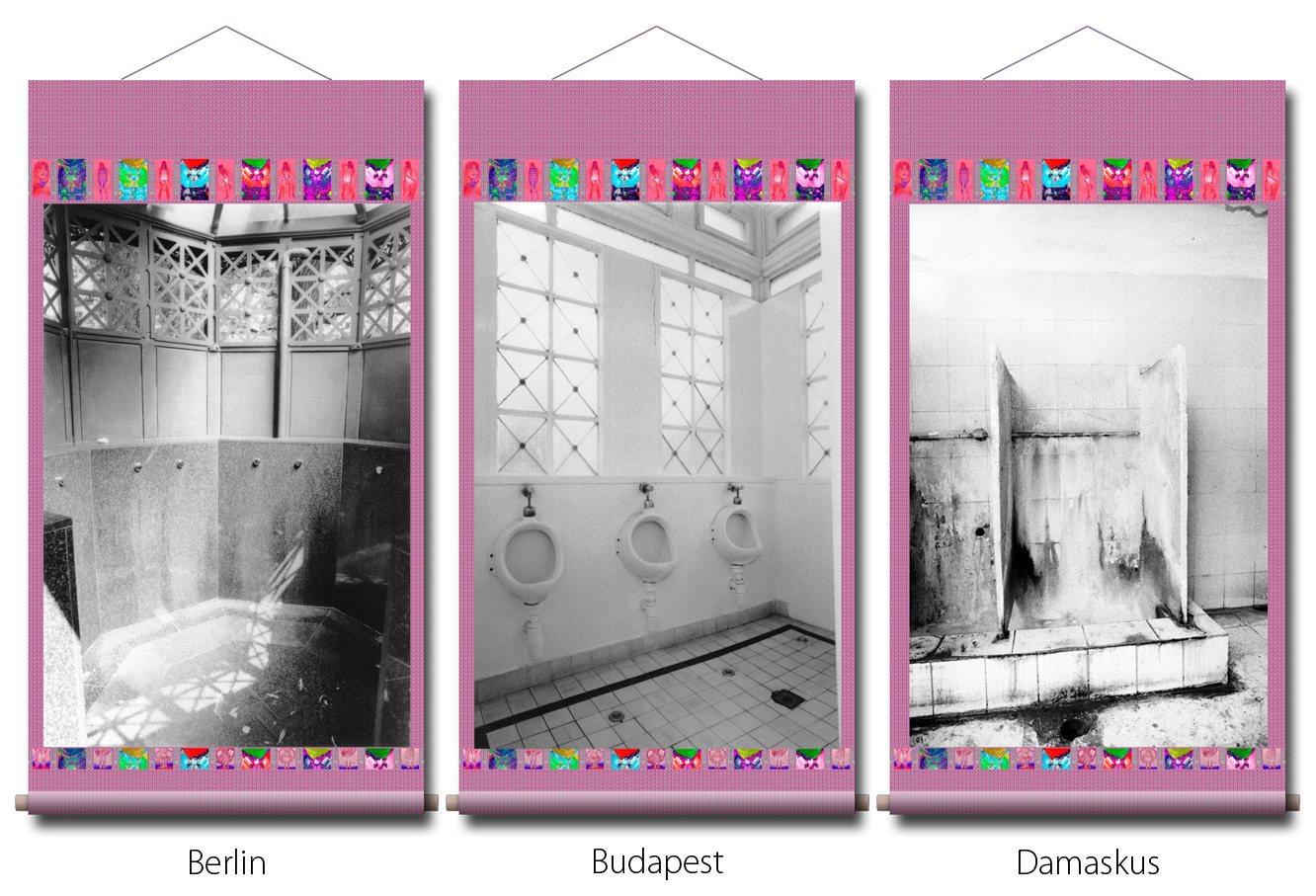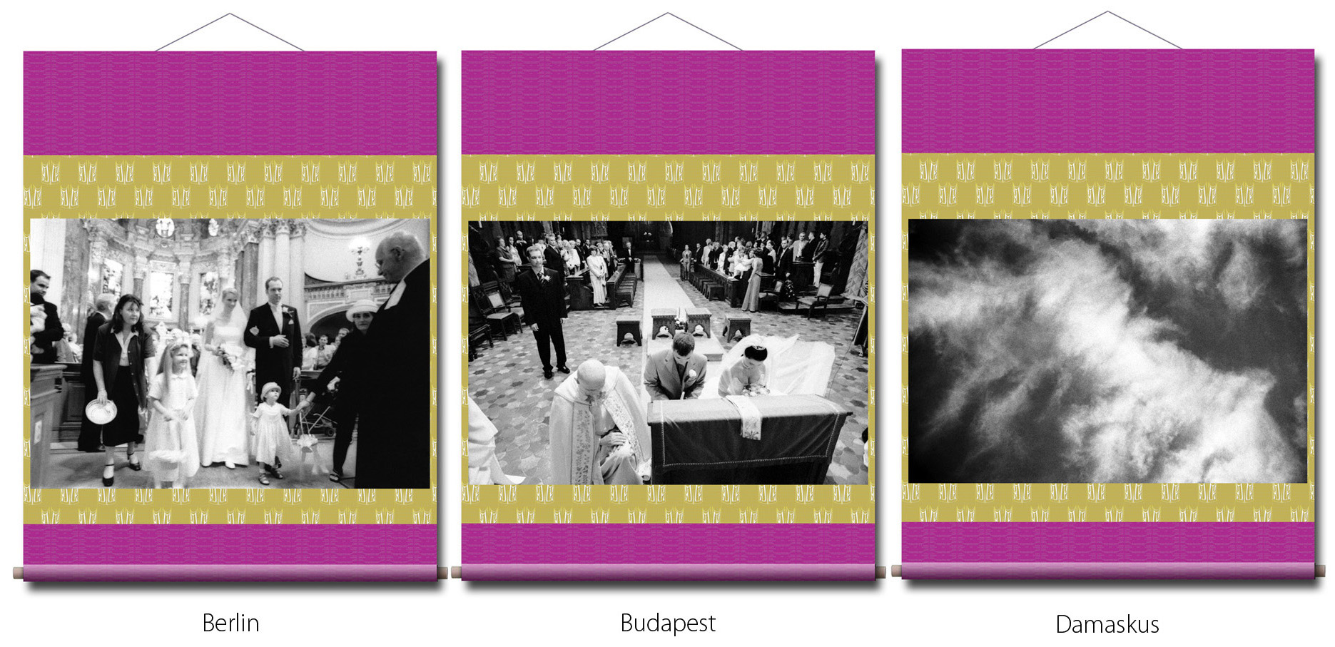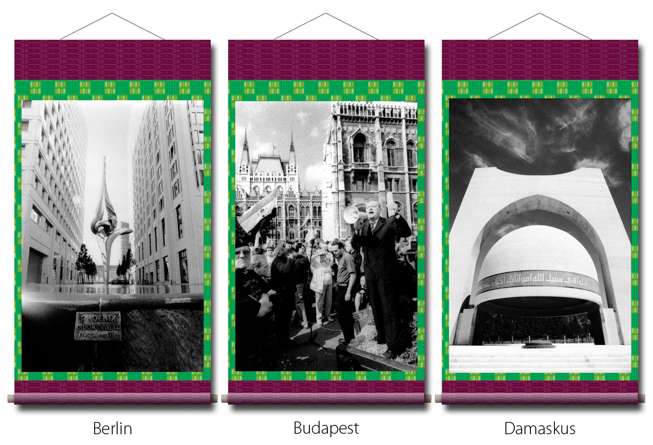 Photographien: in den Ausstellungen sind als großformatige Rollbilder zu sehen. Das flexible Material erinnert an die Stoffkunst der nomadischen und orientalischen Völker. Die Rollbilder sind daher ein idealer transmediterraner Brückenschlag zwischen den Menschen in Europa, Asien und des Nahen Osten.
