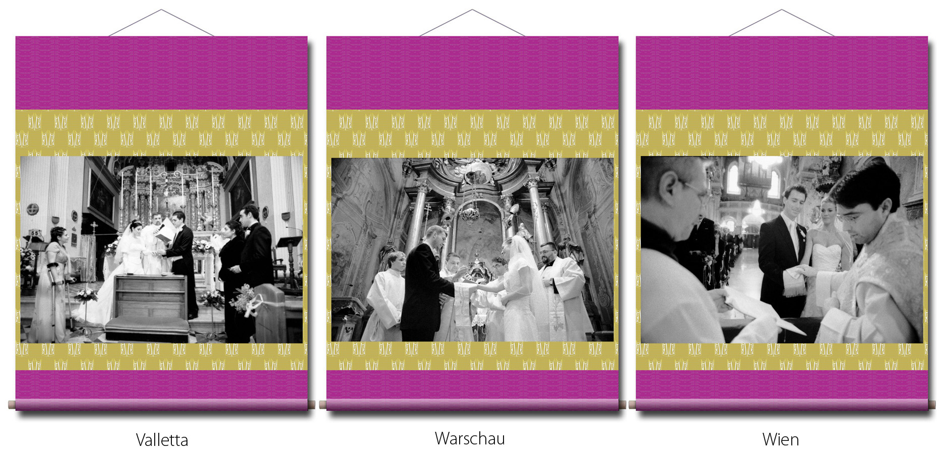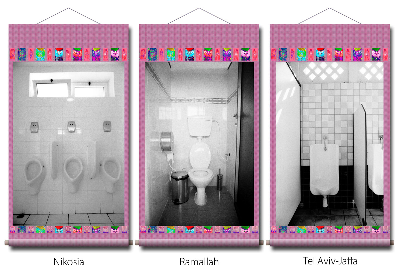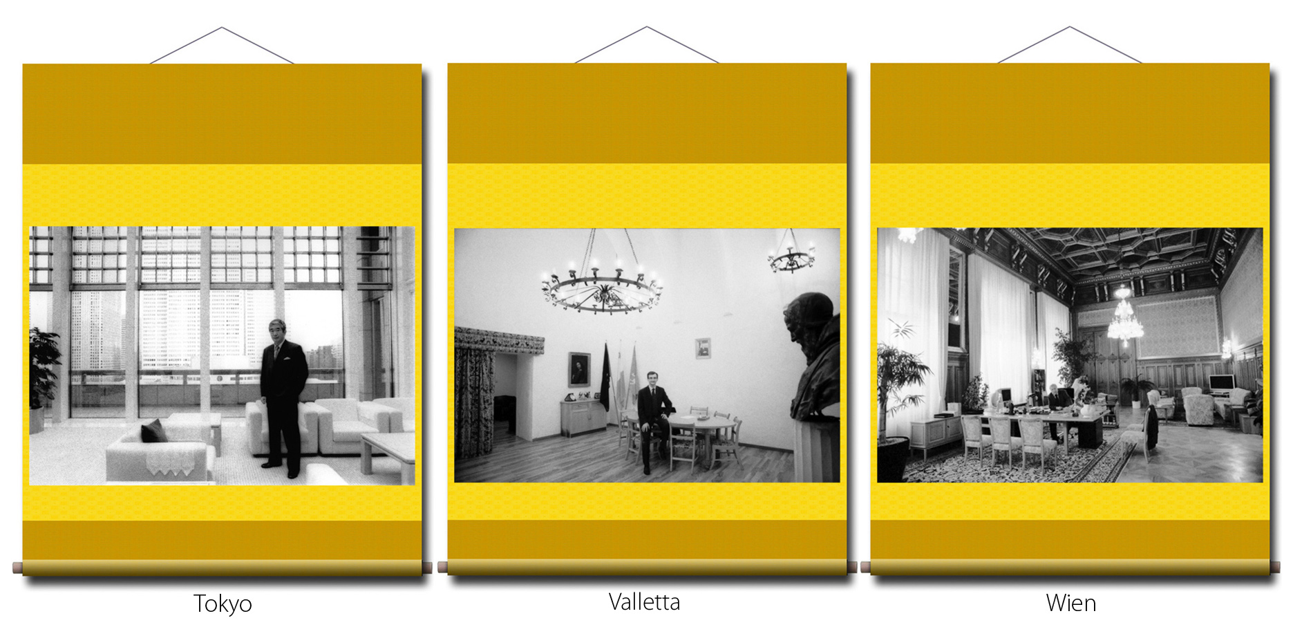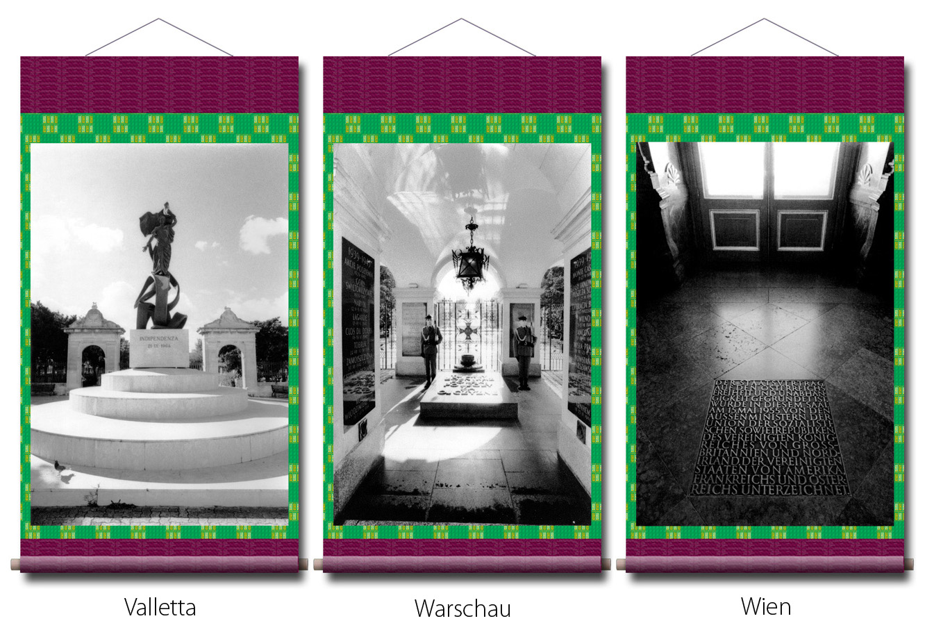 Photographien: in den Ausstellungen sind als großformatige Rollbilder zu sehen. Das flexible Material erinnert an die Stoffkunst der nomadischen und orientalischen Völker. Die Rollbilder sind daher ein idealer transmediterraner Brückenschlag zwischen den Menschen in Europa, Asien und des Nahen Osten.